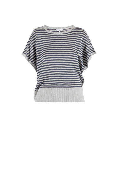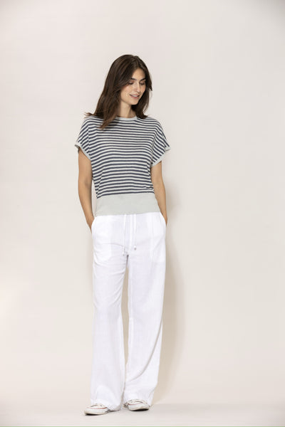 Ein Strickoberteil aus garngefärbtem Leinen mit leichter Struktur und weich gewaschener Oberfläche. Das Modell ist mit weiter Brustpartie und klarer Silhouette gestaltet und erhält durch den gerippten Abschluss einen sauberen, harmonischen Look. Die luftige Qualität sorgt für ein angenehmes Tragegefühl und eine natürliche, sommerliche Ausstrahlung.