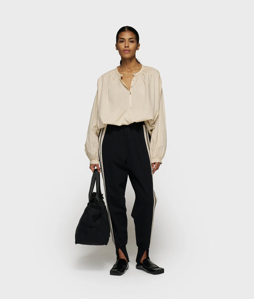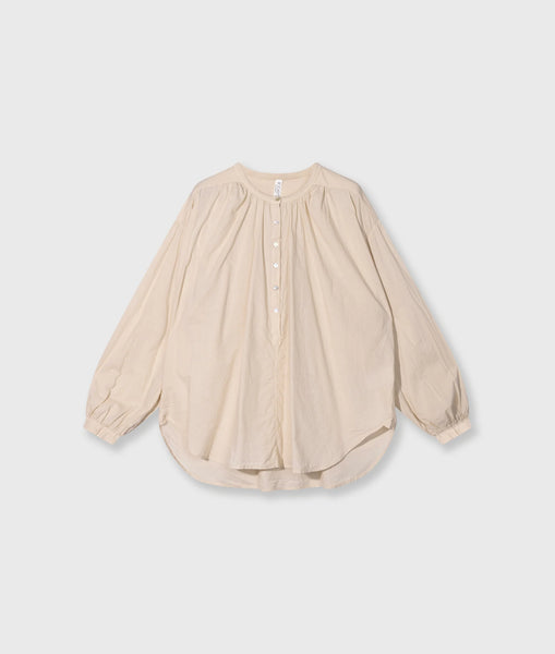 Oversized Fit Bluse aus Ibiza-Voile aus Baumwolle mit Rückenausschnitt und Manschetten aus leicht strukturiertem Jersey. Mit Rundhalsausschnitt mit Rippenkragen, Knopfverschluss und Raffung an Schultern, Brust und Rücken. Mit einem aufgestickten Monogramm auf dem linken Ärmel, Falten über den Manschetten und einem abgerundeten Saum.