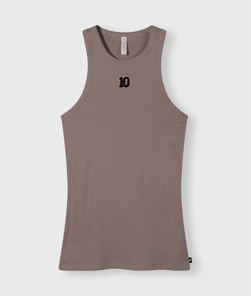 Slim Fit Tanktop aus GOTS-zertifiziertem Bio-Baumwoll-Rippjersey. Mit einem schwarzen Mini-„10“-Aufnäher auf der Brust und Rippstrickbündchen am Halsausschnitt und an den Armausschnitten.