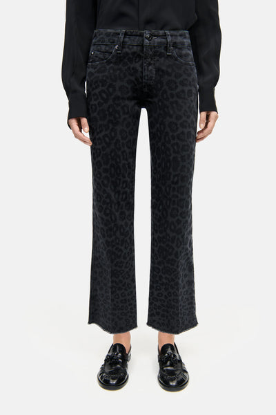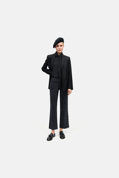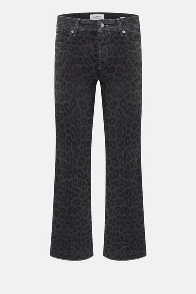 Flared Jeans FRANCESCA in verkürzter Länge. Die Denim in Schwarz überzeugt durch den hohen Tragekomfort des Power Stretch-Stoffs. Ein moderner Laserdruck in Leo-Optik setzt einen markanten Akzent und sorgt für einen trendigen, edlen Look. Diese Jeans vereint Komfort und Stil auf perfekte Weise.